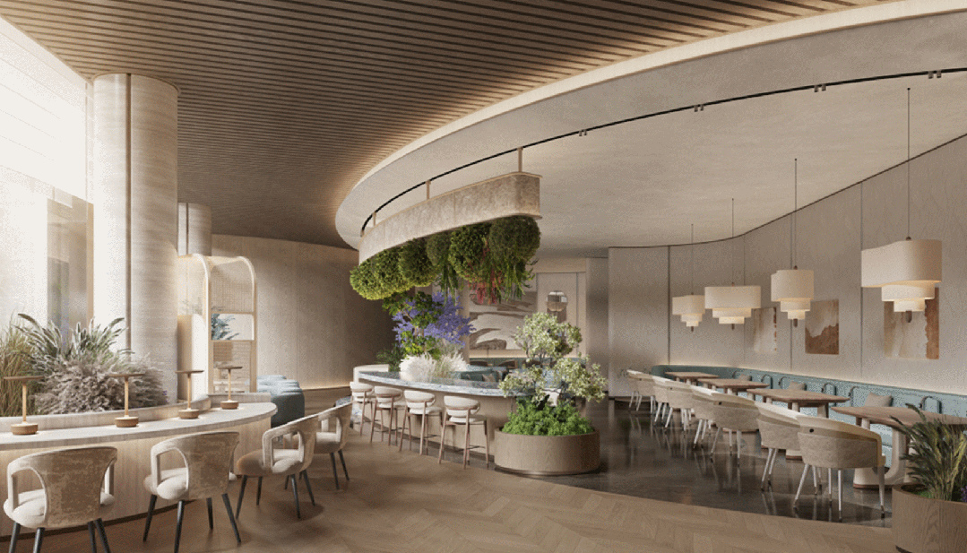 全龄架空层泛会所采用开放式空间设计,将室外五重景观园林自然延伸至架空层内部